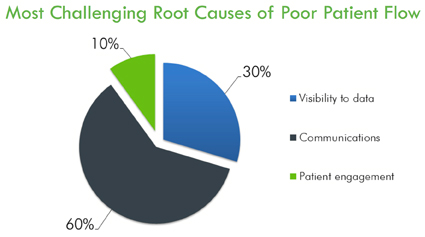 According to the 2012 American Hospital Association assessment, the largest contributor to poor patient flow is communication. The second largest contributor is visibility to data (Figure 3). This is true not only in hospitals, but also in medical clinics and ambulatory surgery centers. RTLS addresses both of these challenges—in addition to maximizing the efficiency of EHR adoption. Clinic staff must ask and answer these questions for every patient: