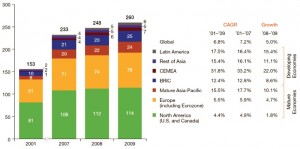 A current study carried out by Capgemini and The Royal Bank of Scotland (RBS) reby Stefan Leibhard and Bernd Ingerling, BTD Group vealed a trend to show a global growth of non-cash payments which went up by 6.8% (per year) between the periods 2001-09 and in 2010 by a further 7.8%. This research also predicts that the volume of non-cash payments transactions will rise in future years from 14% to a staggering 37% in some regions of the world.